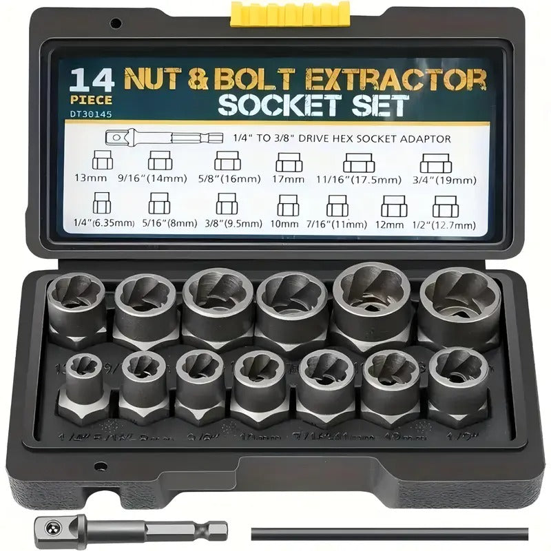 15pcs/Set Nut Extractor, 13pcs Bolt And Nut Remover, 1pc Iron Bar (If The Nut Is Still Stuck In The Sleeve When Removing It, Use It to Knock It Out), 1pc 1/4 '' to 3/8 "drive Hexagonal Socket Adapter