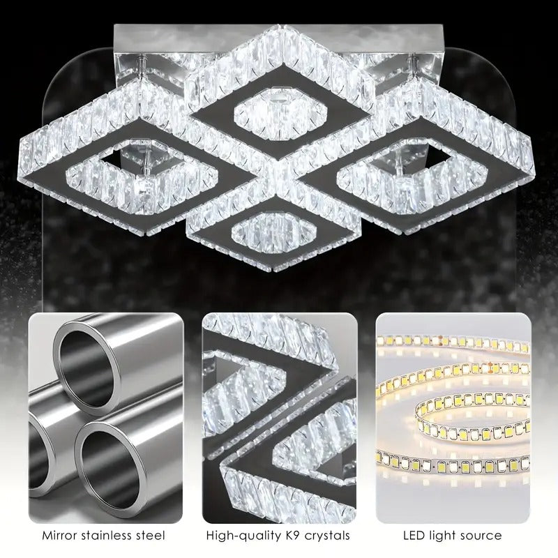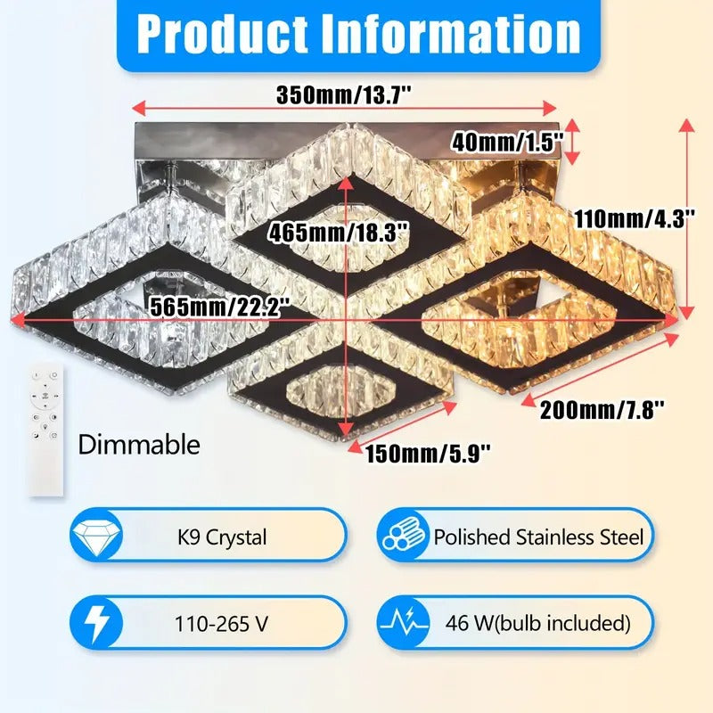 22" Modern Crystal Chandelier with Remote Control - 4-Light LED Flush Mount Ceiling Light, Polished Finish, Dimmable & Adjustable Brightness for Living Room, Bedroom, Kitchen,