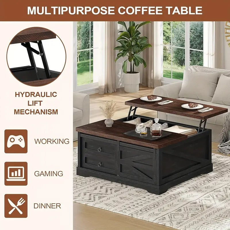 39.4" Lift Coffee Table with Storage, Sliding Barn Door and Adjustable Shelf, Farmhouse Square Center Table with Large Hidden Compartment and 2 Drawers, Suitable for Living Room, Black