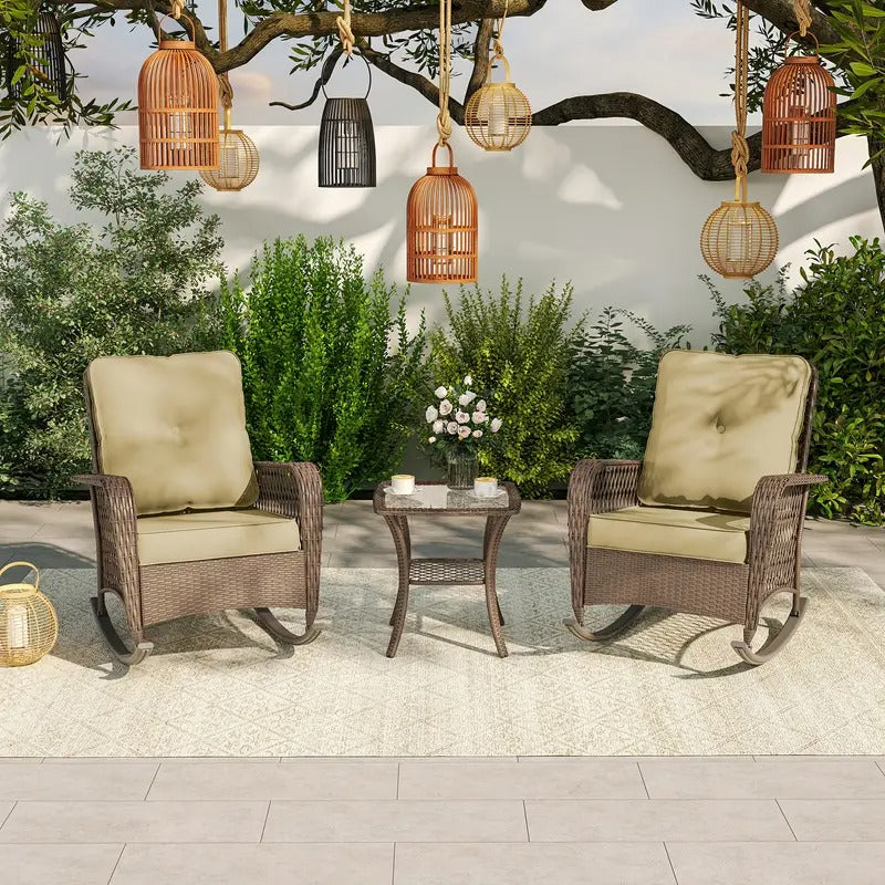 3pcs Patio Set Rocking, Rattan Outdoor Rocking Patio Bistro Set With 2 Rockers And 1 Side Table With 4'Thick Cushions For Backyard, Porch, Balcony, Poolside, And 1piece Of Chair Can Choose