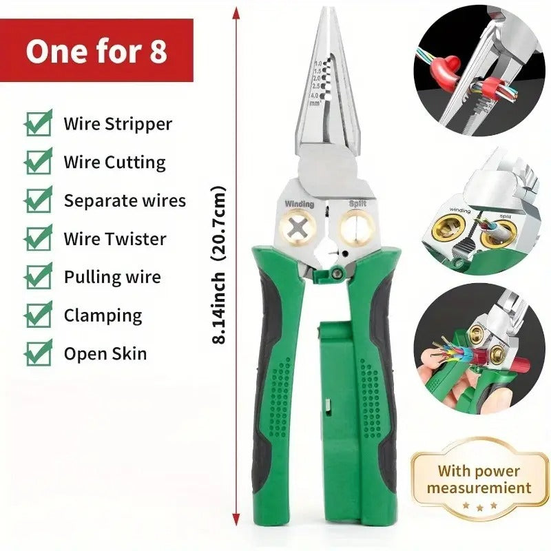 8-in-1 Wire Crimper Stripper with Voltage Detector & Dual Alarms - Heavy Duty 12-250V AC/DC Tester for Hot/Neutral Wires - Electrician, HVAC, Car Repair Tool (Green), Wire Stripping Tool, Electrician Essentials, Ergonomic Design, Robust Construction