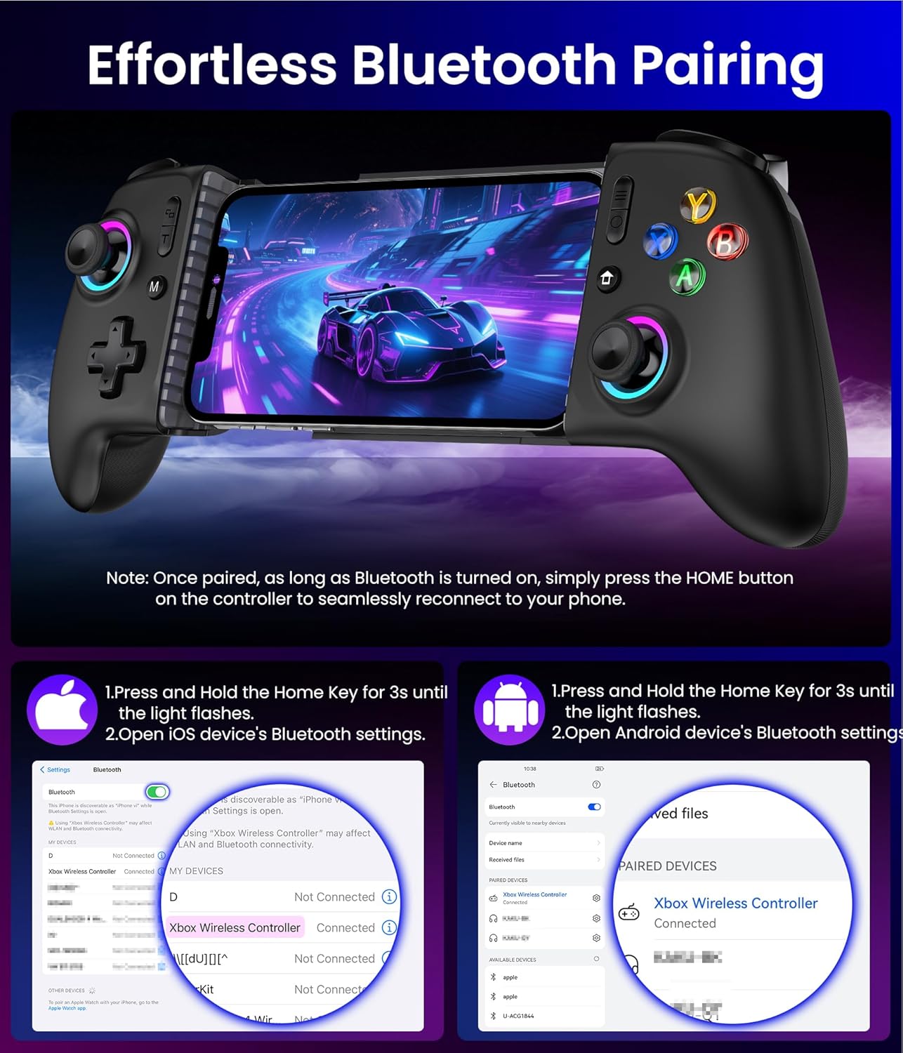 【Anti-Drift & Fast-Connect】Wireless Gaming Controller for iPhone/Android, Hall Joystick&Trigger Bluetooth Phone Controller, Handheld Game Console Quality - For Cloud Gaming,Genshin Impact,Roblox,Call of Duty