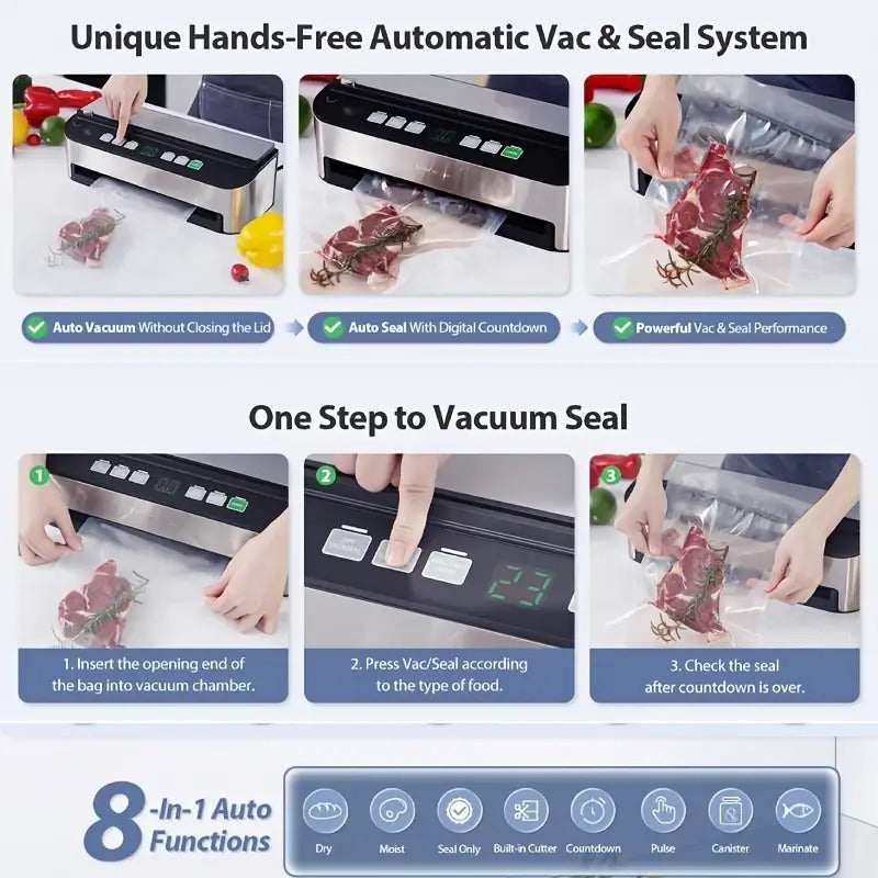 Beelicious 85000Pa 8-in-1 Vacuum Sealer Machine – Fully Automatic Food Sealer With Bag Storage, Built-in Cutter, Moist Mode, Air Suction Hose & Vacuum Bags Included | Digital Countdown | Sous Vide Ready