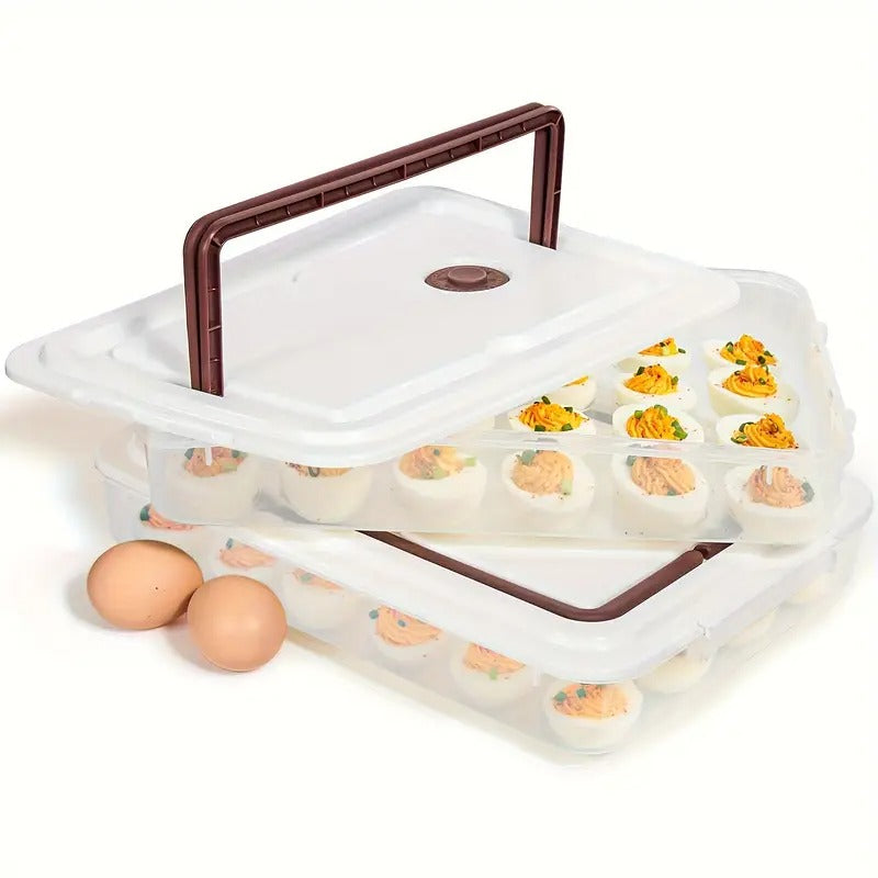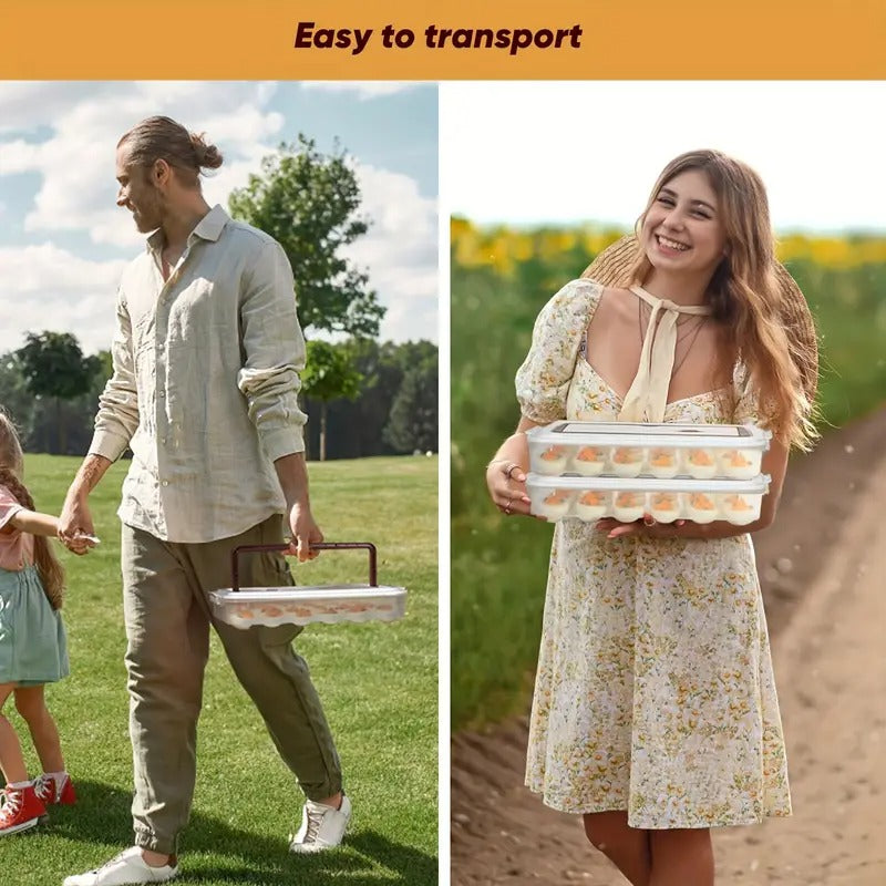 Deviled Egg Containers with Lid (Set of 2), Plastic Devil Egg Carrier for 48 Eggs with Brown Handle, Clear Storage Egg Platter, Portable Fridge Egg Tray, Perfect for Picnic and Party
