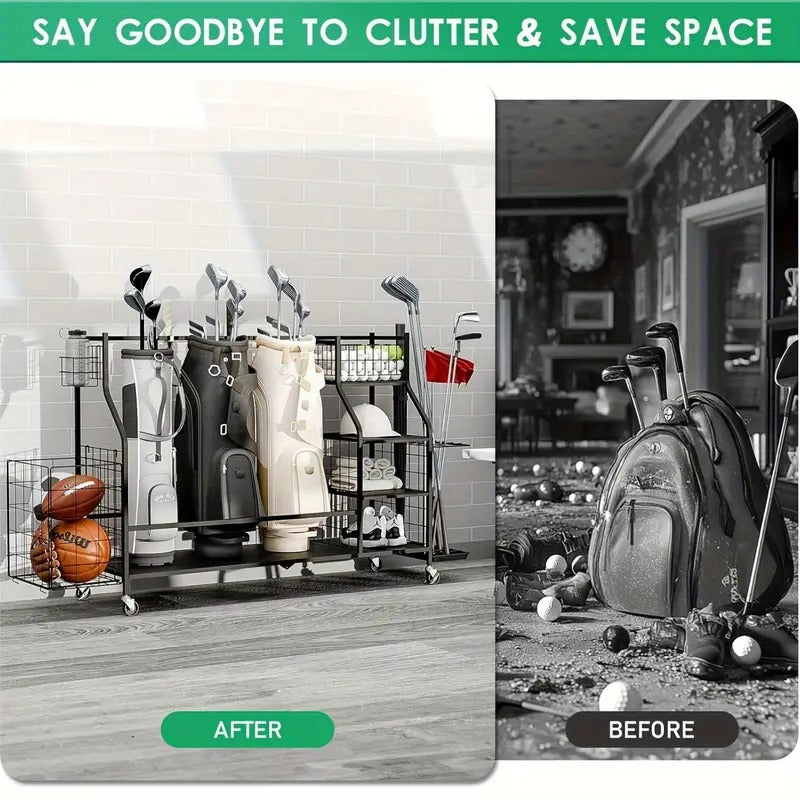 Golf Bag Storage Organizer, For 3 Golf Bags And Equipment Storage Rack With Wheels, Golf Bag Organizer With Side Storage For Golf Equipment Accessories