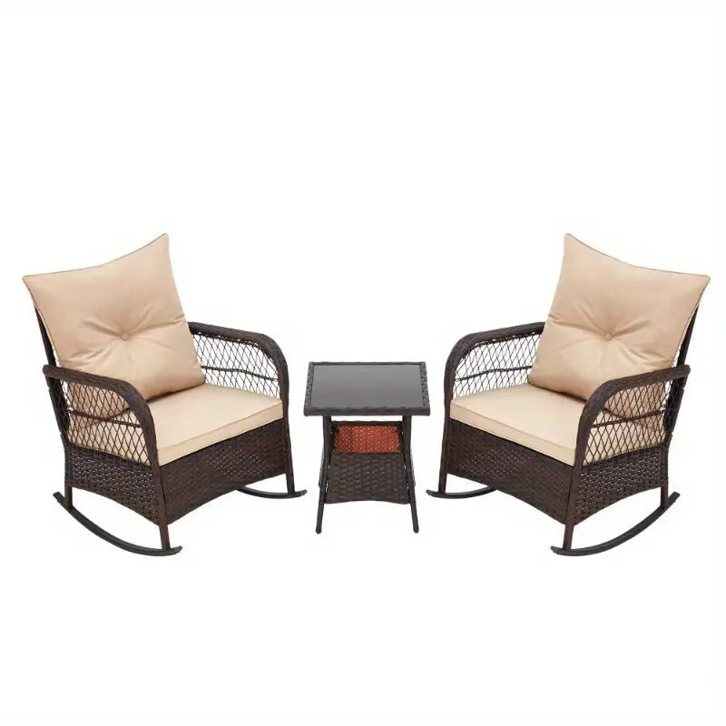 [Outdoor | Rattan] 3pcs Outdoor Rocking Bistro Set | Pation Rattan Furniture Set of 3 with 2 PE Rocking Chairs and 1 Tempered Glass Coffee Table | for Porch, Garden, Beige/ Blue/ Gray