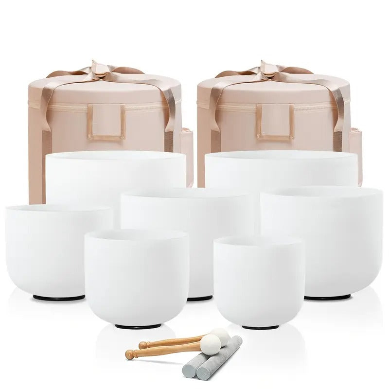 [Quartz Crystal] 432Hz 6"-12" Set Of 7 Chakra Frosted Quartz Crystal Singing Bowl Sound Bath Bags | Frosted Chakra Quartz Crystal Singing Bowls | For Bath Sound Bowls Meditation Set Yoga