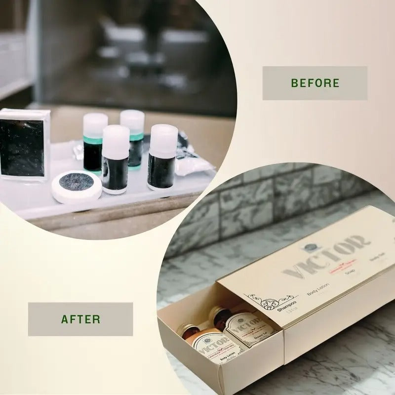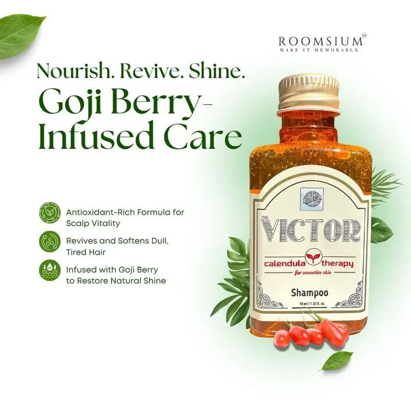 Roomsium Victor 75-Piece Guest Toiletries Set – 15 Individually Boxed Amenity Kits with Travel-Size Shampoo, Conditioner, Shower Gel, Body Lotion & Soap Bar – Goji Berry & Calendula